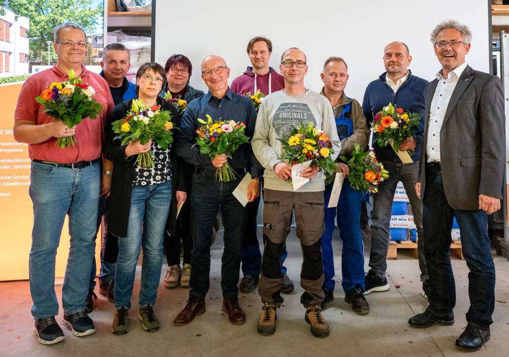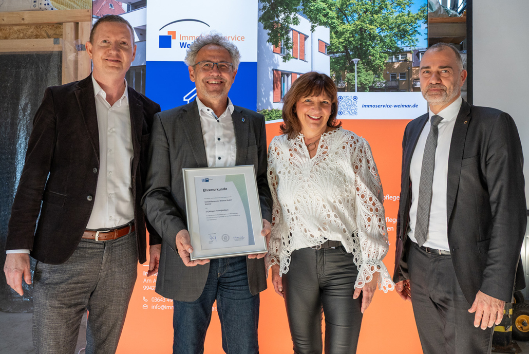 Vor über 25 Jahren fiel der Startschuss für die Gründung der Immobilienservice Weimar GmbH, die eine hundertprozentige Tochter der Weimarer Wohnstätte GmbH ist. Der Wunsch nach einem wirtschaftlich arbeitenden und flexibel agierenden Partner, der den Wohnungs- und Immobilienbestand professionell betreut, reicht bis zum Ende der 1990er Jahre zurück. Was im Jahr 2000 mit einigen wenigen Mitarbeitern begann, hat sich zu einem 70 Mann- und Frau-starken Unternehmen entwickelt. Deshalb sind zur Übergabe der IHK-Ehrenurkunde auch viele Mitarbeiter und Mitarbeiterinnen der „ersten Stunde“ anwesend. „Uns war es wichtig, auch diejenigen einzuladen, die den Immobilienservice mit aufgebaut und so den Grundstein dafür gelegt haben, was wir heute sind.“, sagt Geschäftsführer Udo Carstens. Er blickt auf die Anfänge zurück und nennt die wesentlichen Meilensteine der Unternehmensgeschichte. „Sie können zurecht stolz sein auf das, was Sie in den letzten 25 Jahren erreicht haben und ich bedanke mich ausdrücklich bei Ihnen allen, dass Sie unsere kommunalen Immobilien so gut in Schuss halten!“, gratuliert Oberbürgermeister und Aufsichtsratsvorsitzender Peter Kleine anerkennend. „Für uns gehören solche feierlichen Anlässe immer wieder zu den schönen Momenten unseres Amtes, da sie ein positives Signal aussenden und anderen Unternehmen in den schwierigen Zeiten Mut machen“ erklären Annette Projahn, Vorsitzende des Wirtschaftsbeirates Weimar/Weimarer Land, und Markus Heyn, Leiter des IHK-Regionalbüros Weimar. Sie sind zum Betriebshof in den Weimarer Norden gekommen, um die Ehrenurkunde persönlich zu überreichen.